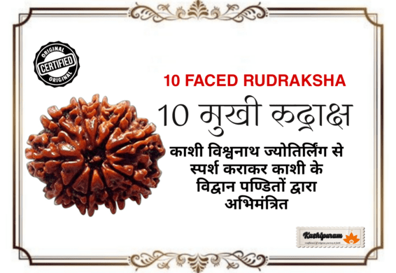 - 10 मुखी रुद्राक्ष मनका काशी विश्वनाथ धाम में पवित्र ज्योतिर्लिंग से स्पर्श कराकर, विश्व प्रसिद्ध काशी के विद्वान् पंडितों द्वारा अभिमंत्रित किया जाता है। इस प्रक्रिया से इसे विशेष शक्ति और कल्याणकारी ऊर्जा प्राप्त होती है।