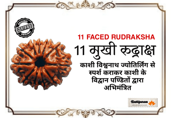 - 11 मुखी रुद्राक्ष मनका काशी विश्वनाथ धाम में पवित्र ज्योतिर्लिंग से स्पर्श कराकर, विश्व प्रसिद्ध काशी के विद्वान् पंडितों द्वारा अभिमंत्रित किया जाता है। इस प्रक्रिया से इसे विशेष शक्ति और कल्याणकारी ऊर्जा प्राप्त होती है।
